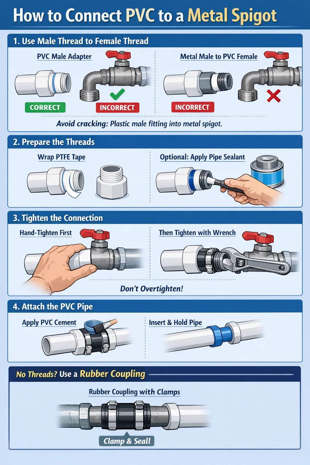 Att ansluta PVC-rör till en metalltapp (metallkran eller ventil) är en vanlig uppgift vid VVS-reparationer. På grund av plast och metalls olika hårdhet och termiska expansion/sammandragningshastigheter krävs särskild försiktighet vid anslutning för att förhindra läckor eller spruckna beslag.