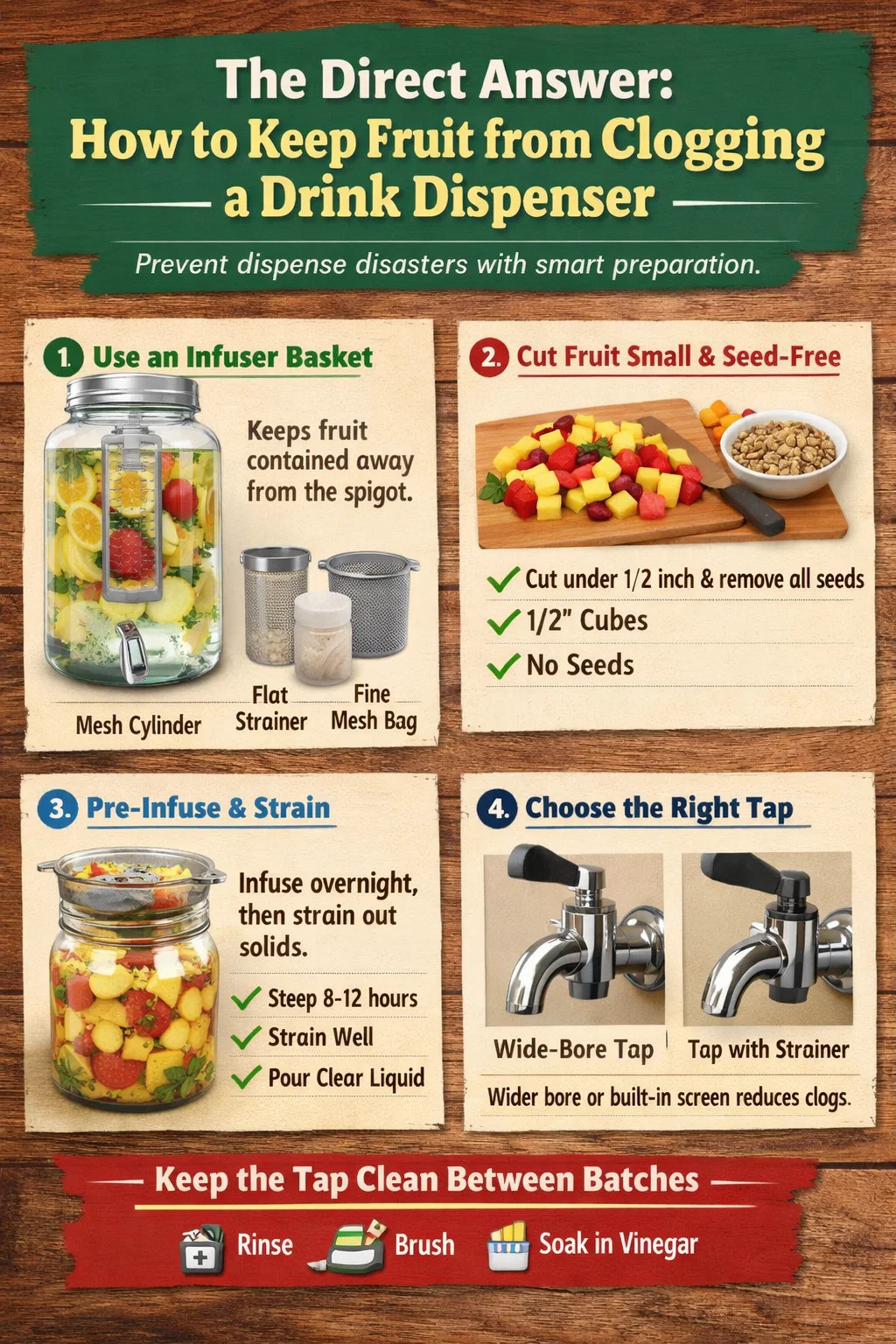 Det mest effektiva sättet att förhindra att frukt täpper till en dryckesautomat är att använda en infusionskorg, sila av vätskan innan du fyller dispensern och skär frukt i bitar som inte är större än en halv tum. Om du använder en Dryckesautomatkran i metall , tappöppningen är vanligtvis mellan 10 mm och 20 mm i diameter - fruktkött, frön och skalfragment kan blockera denna öppning inom några minuter efter att den hällts, särskilt i varma miljöer där fruktköttet bryts ner snabbare. Att kombinera fysiska hinder med korrekt fruktberedning eliminerar nästan alla tilltäppningsrelaterade problem innan de börjar.