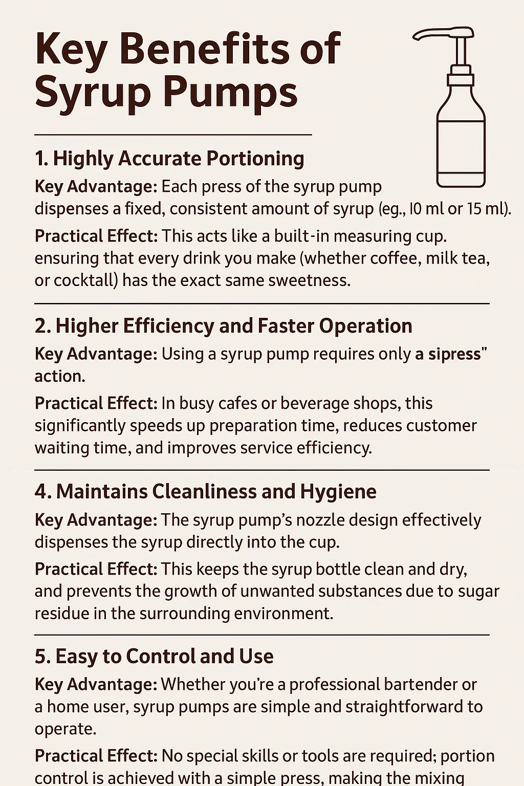 Nyckelfördel: Varje tryck på sirapspumpen ger en fast, konsekvent mängd sirap (t.ex. 10 ml eller 15 ml).