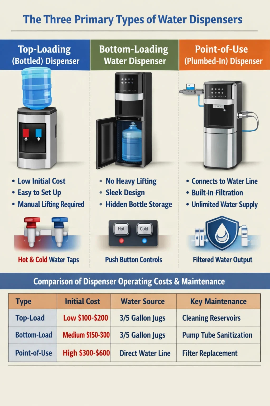 När man utvärderar hydratiseringslösningar för ett hem eller kontor, kategoriseras vattenautomater i allmänhet i tre olika typer baserat på deras laddningsmekanism och vattenkälla: Toppmatade (flaska) dispensrar, bottenmatade dispensrar och Point-of-use (rörlagda) dispensrar. Varje system använder en specifik vattendispenser kran konfiguration för att hantera flödet, och att välja rätt beror på ditt fysiska utrymme, budget och önskad underhållsnivå.