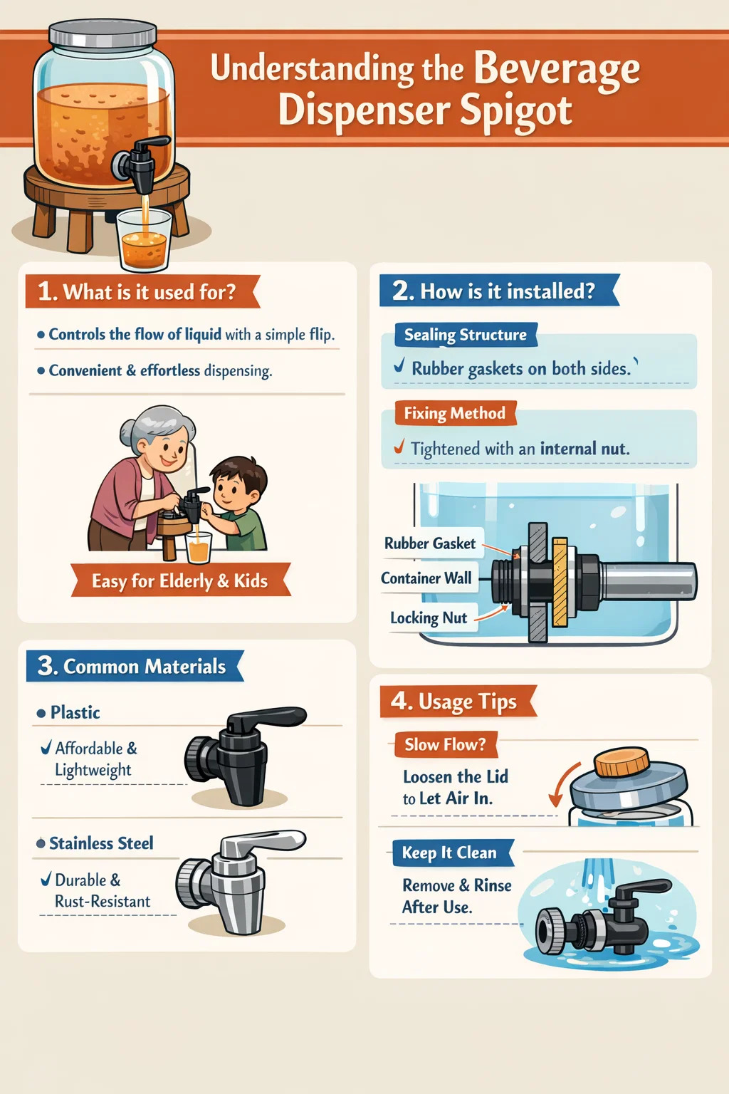 En dryckesutmatningstapp är den lilla kranen eller ventilen installerad i botten av en dryckesbehållare eller vattentank. Det är hjärtat i hela containern; utan den måste du lyfta den tunga behållaren för att hälla på vätskan.
