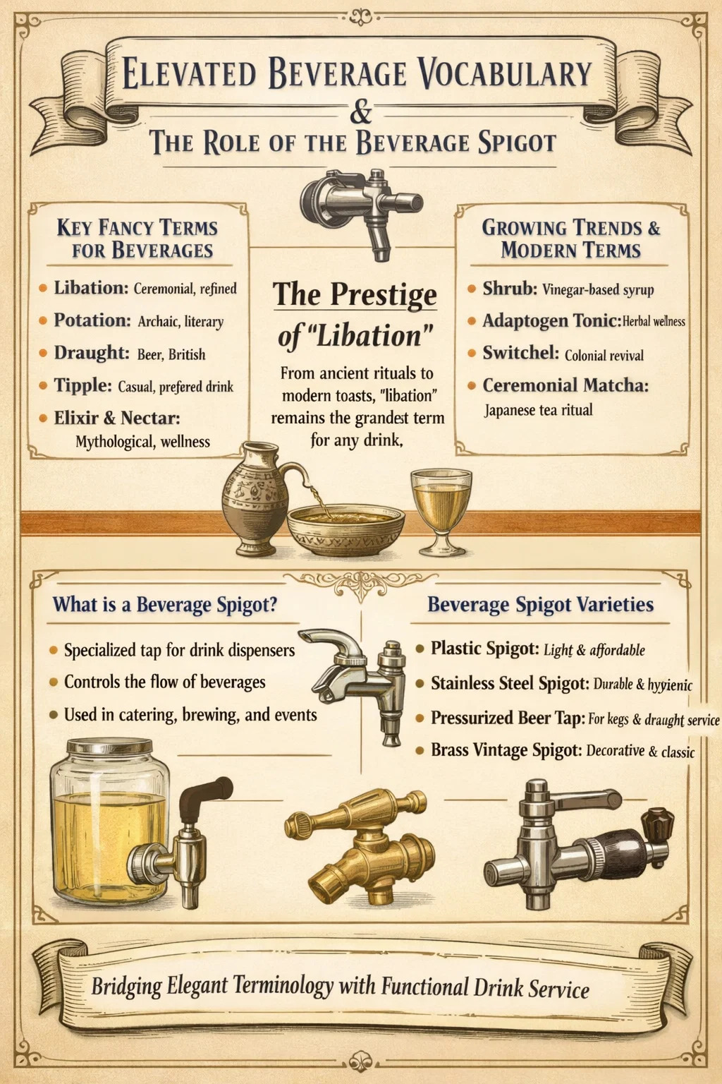 Engelska erbjuder ett förvånansvärt rikt lexikon av raffinerade eller ovanliga termer för drycker. Följande tabell organiserar de viktigaste efter formalitet, ursprung och typisk användningskontext: